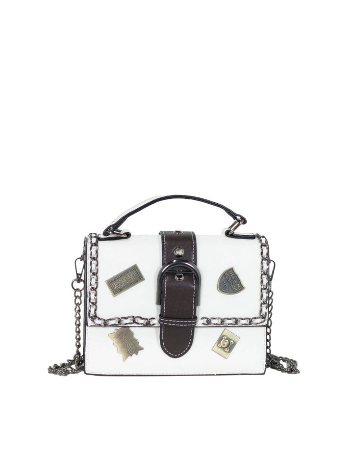 Bolso moderno con correa y hebilla delantera decorativa, cadena trenzada fija en bordes de tapa delantera, pines metálicos delanteros decorativos, broches magnéticos, tres compartimentos internos, uno con cierre, cadena con correa removible.