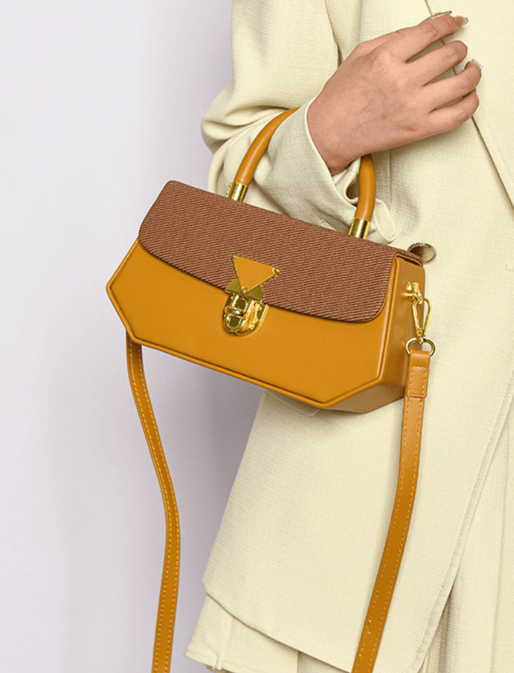 Bolso de mano estructurado con una forma hexagonal distintiva. La solapa superior presenta un elegante panel con textura de tejido, contrastando con el resto del cuerpo liso. Destaca por sus detalles de herrajes dorados, incluyendo un cierre de giro frontal. Incluye un asa superior semi-rígida y una correa larga y delgada para un estilo versátil y chic.