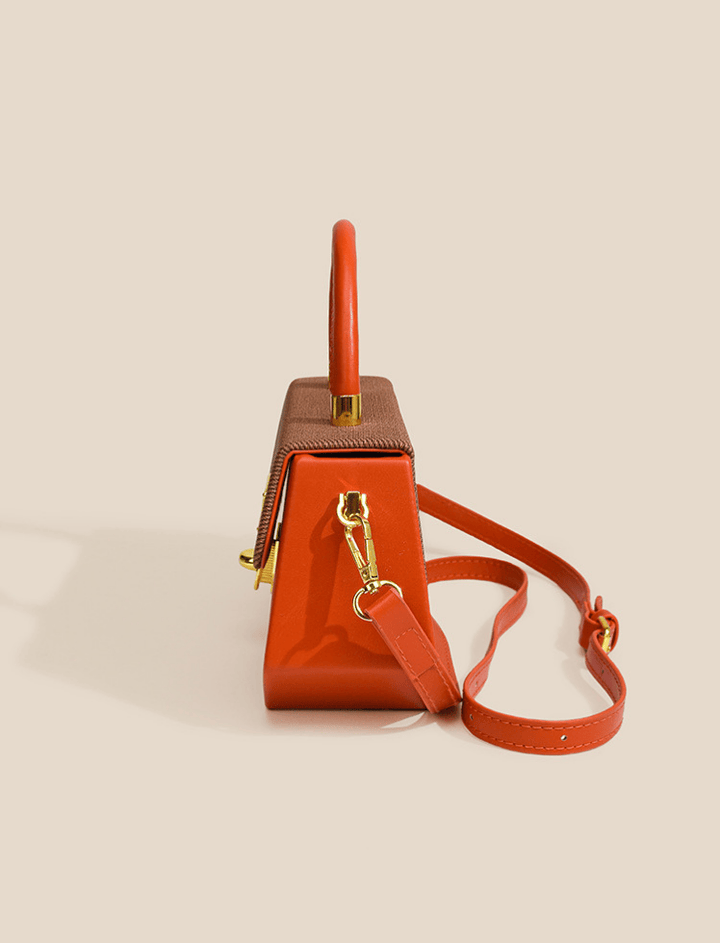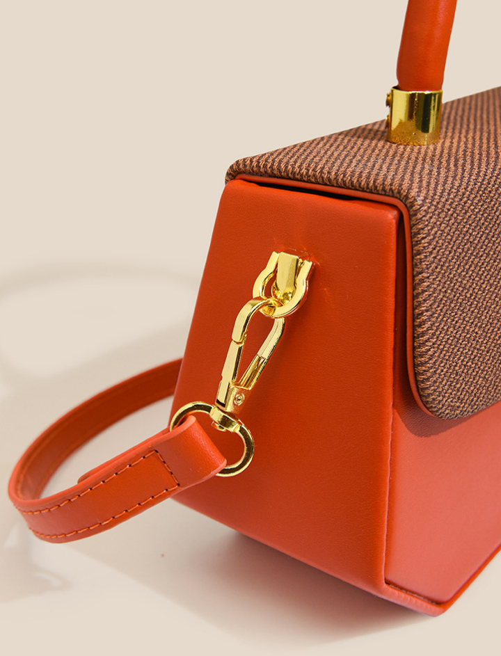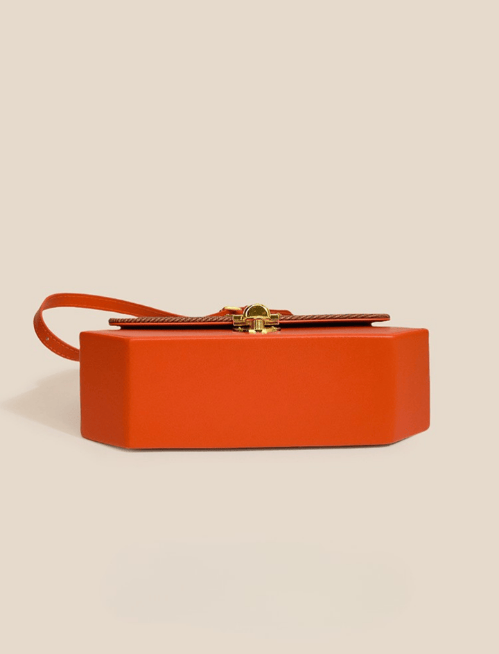 Bolso de mano estructurado con una forma hexagonal distintiva. La solapa superior presenta un elegante panel con textura de tejido, contrastando con el resto del cuerpo liso. Destaca por sus detalles de herrajes dorados, incluyendo un cierre de giro frontal. Incluye un asa superior semi-rígida y una correa larga y delgada para un estilo versátil y chic.