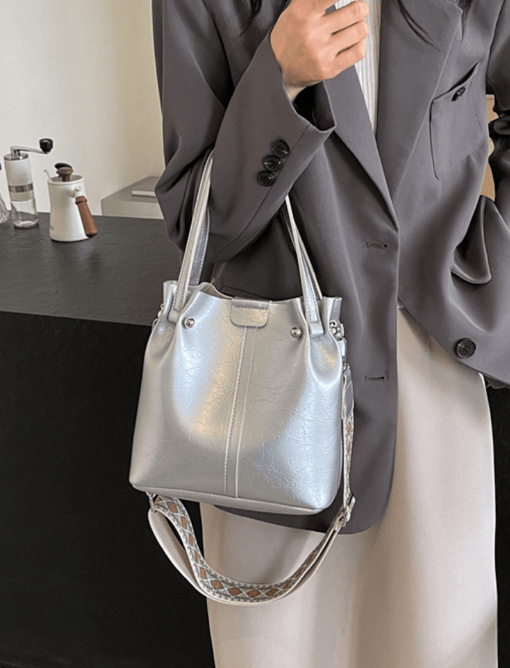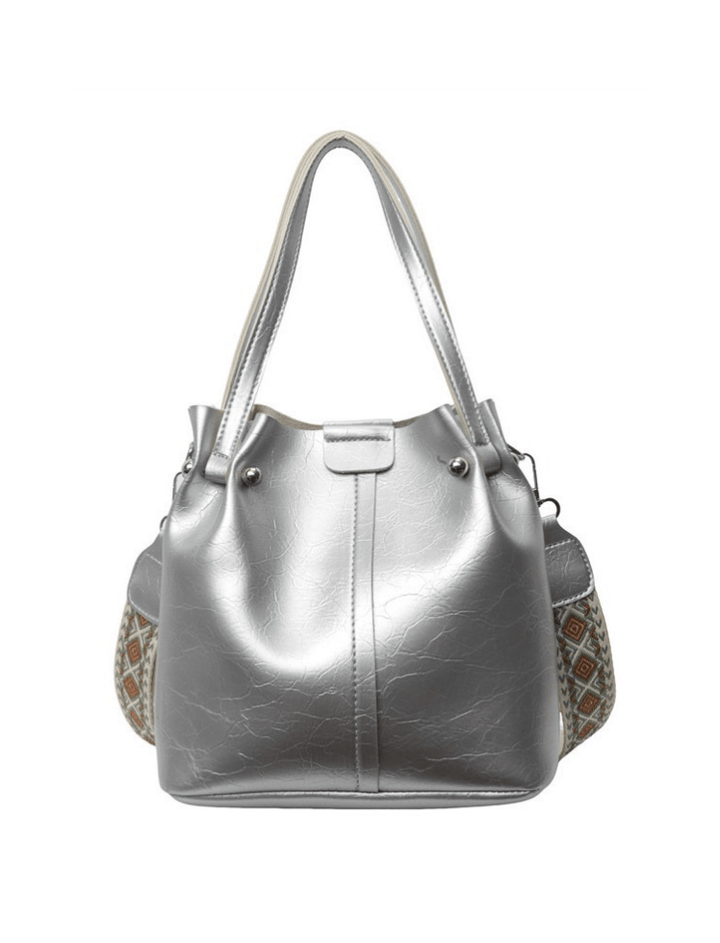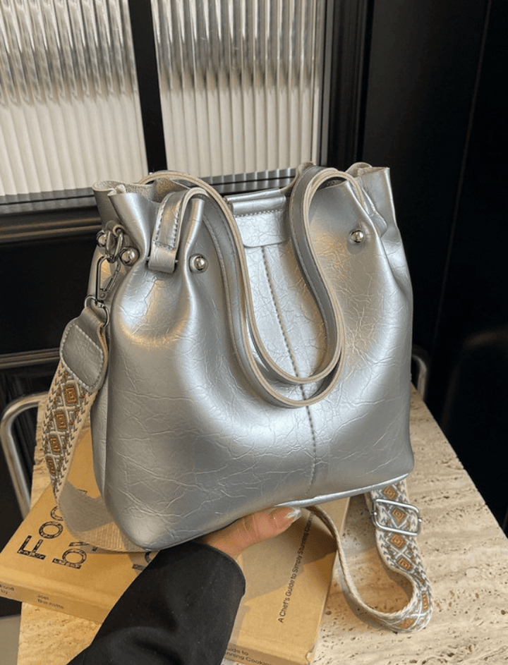 Bolso de estilo bucket con acabado brillante y moderno. Incluye asas cortas a juego y una correa ancha removible con estampado geométrico para un toque crossover. Su silueta se define con detalles metálicos decorativos. Ideal para un look audaz y versátil.