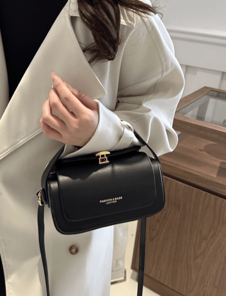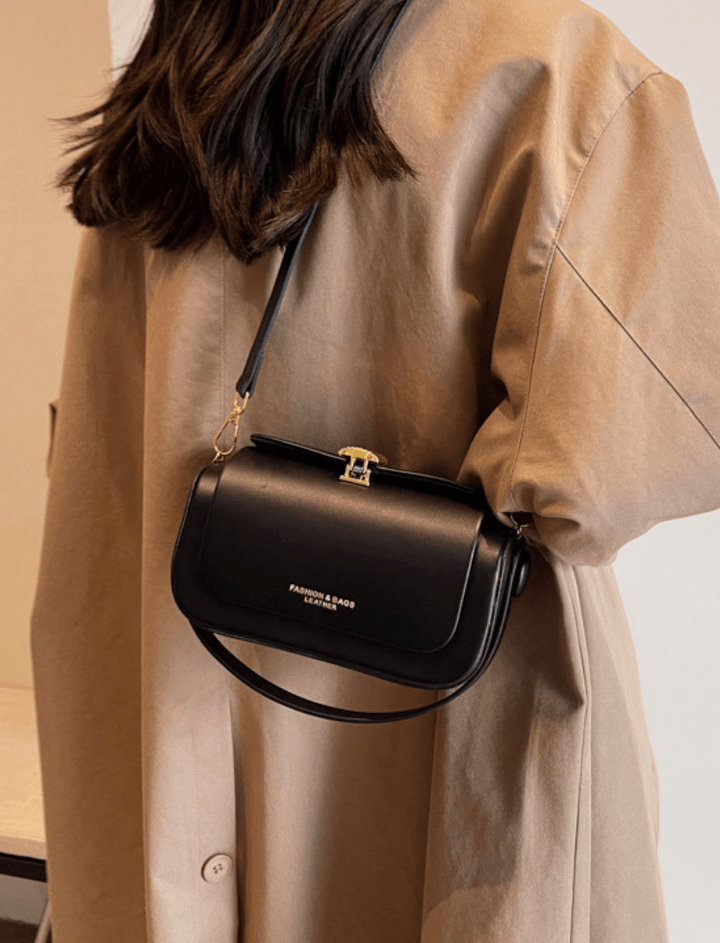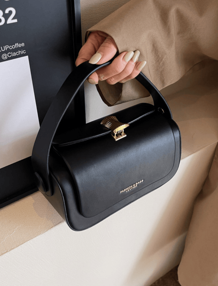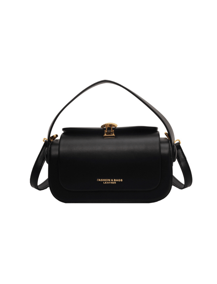 Bolso de hombro o crossbody con una silueta rectangular de bordes suaves y estilo baguette. Presenta un diseño liso y minimalista con una solapa frontal semicircular. Destaca un cierre central metálico dorado de diseño vintage. Cuenta con una asa de mano corta y una correa ajustable y removible. Ideal para un look sofisticado y atemporal.