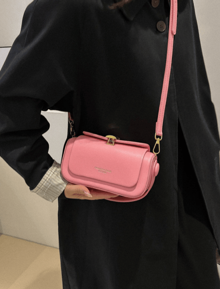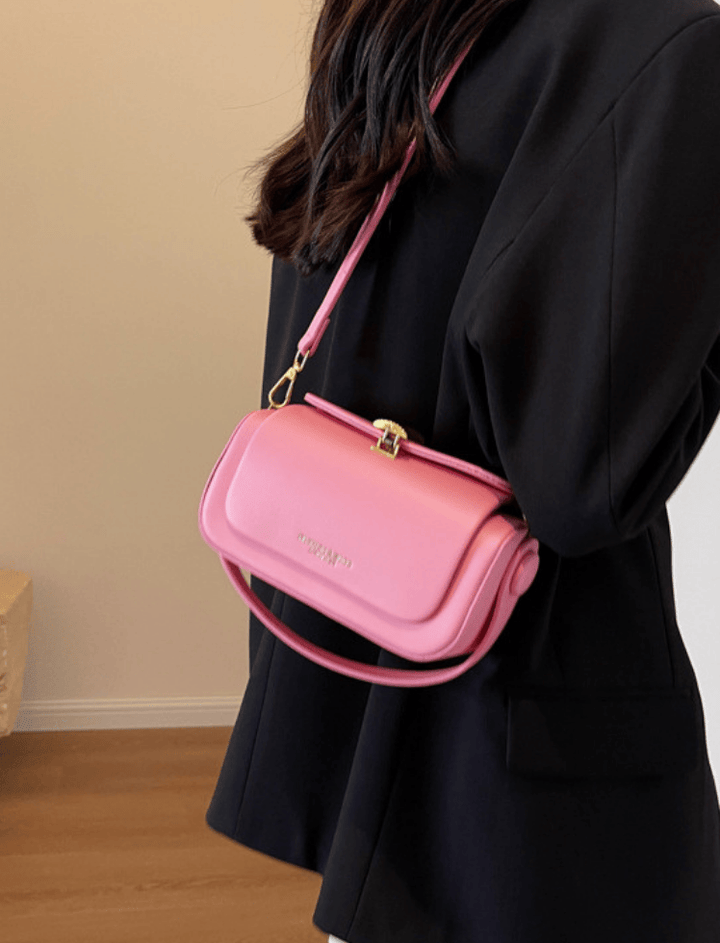 Bolso de hombro o crossbody con una silueta rectangular de bordes suaves y estilo baguette. Presenta un diseño liso y minimalista con una solapa frontal semicircular. Destaca un cierre central metálico dorado de diseño vintage. Cuenta con una asa de mano corta y una correa ajustable y removible. Ideal para un look sofisticado y atemporal.