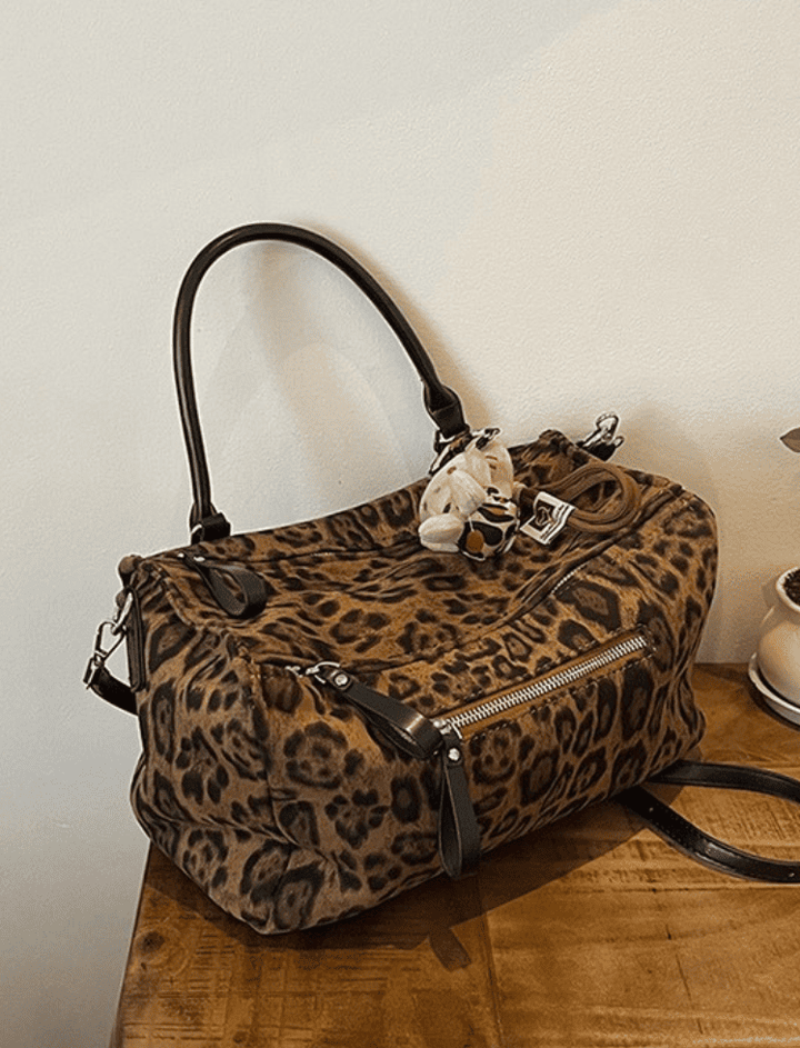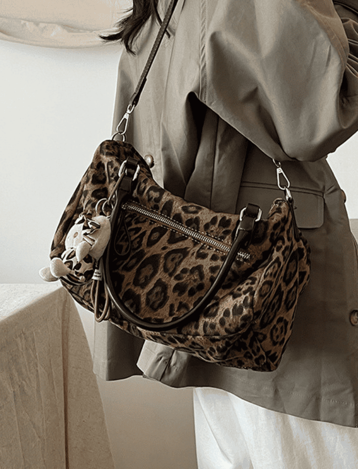 Estampado animal print, confeccionado en tela suave tipo felpa para un acabado cómodo y llamativo. Incluye asas resistentes, correa ajustable para llevar cruzado y un llavero decorativo de peluche que le da un toque tierno y divertido. Amplio, liviano y lleno de actitud, es ideal para el día a día, salidas casuales o looks urbanos con personalidad.