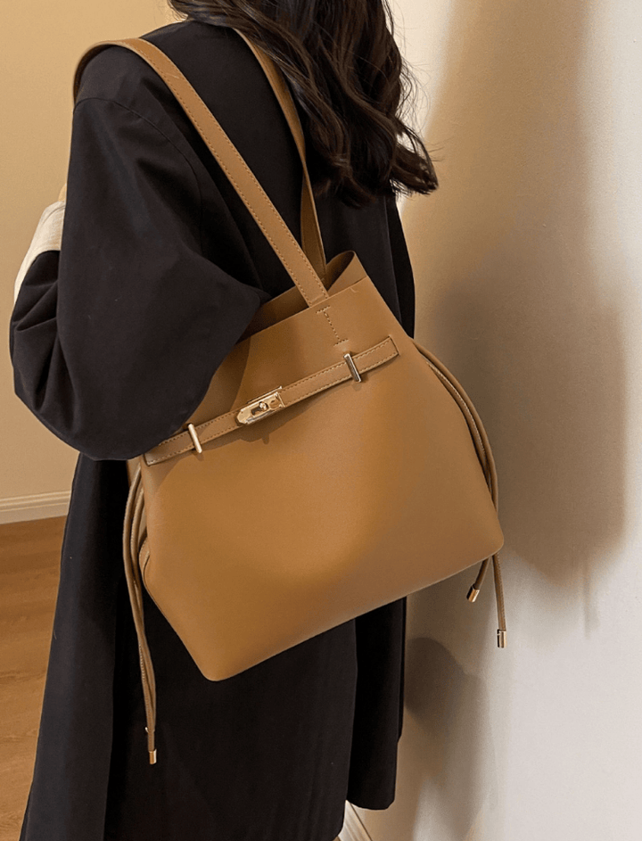 Sofisticado y funcional, este bolso tipo bucket está elaborado en cuero sintético de alta calidad con acabado liso y estructura firme. Su diseño minimalista se complementa con herrajes dorados que aportan un toque de lujo discreto. Cuenta con cierre ajustable tipo cinturón y asas resistentes que permiten llevarlo al hombro o en la mano. Perfecto para quienes buscan elegancia y practicidad en un accesorio de uso diario.
