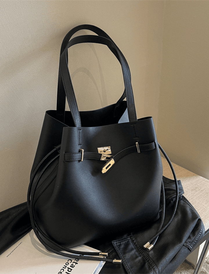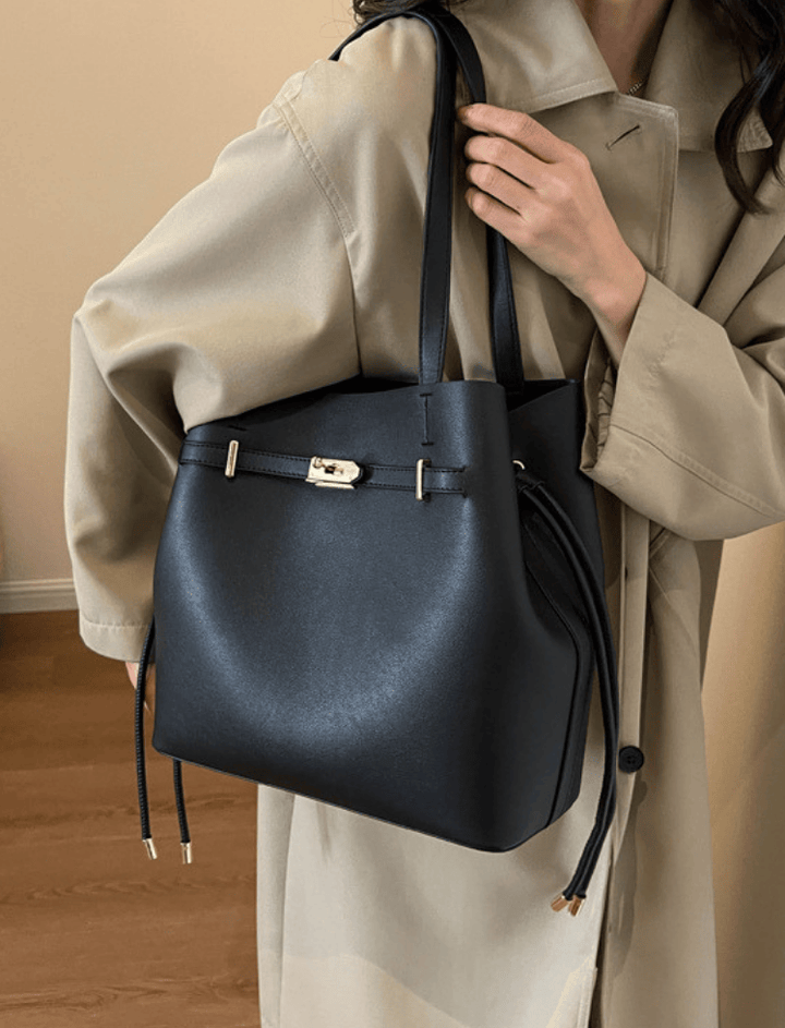 Sofisticado y funcional, este bolso tipo bucket está elaborado en cuero sintético de alta calidad con acabado liso y estructura firme. Su diseño minimalista se complementa con herrajes dorados que aportan un toque de lujo discreto. Cuenta con cierre ajustable tipo cinturón y asas resistentes que permiten llevarlo al hombro o en la mano. Perfecto para quienes buscan elegancia y practicidad en un accesorio de uso diario.