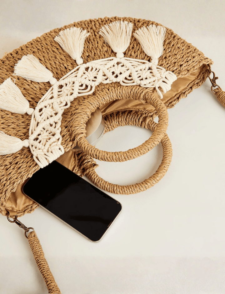 Bolso de estilo crossbody con forma semicircular, confeccionado en material de paja o yute trenzado. Su diseño destaca por un aplicación frontal de encaje calado o macramé que forma un semicírculo decorativo, adornado con múltiples borlas largas y suaves. Cuenta con una asa de mano superior circular y una correa larga y trenzada para llevarlo al hombro o cruzado. Un accesorio artesanal que combina la textura rústica con la delicadeza boho.