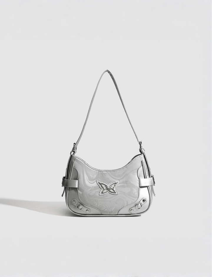 Un bolso de diseño elegante con textura suave, detalles metálicos y un delicado adorno de mariposa al centro. Costuras definidas, aplicaciones decorativas y una silueta compacta lo convierten en el accesorio perfecto para un estilo femenino y moderno.