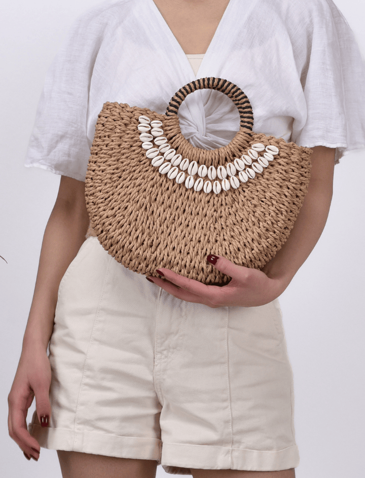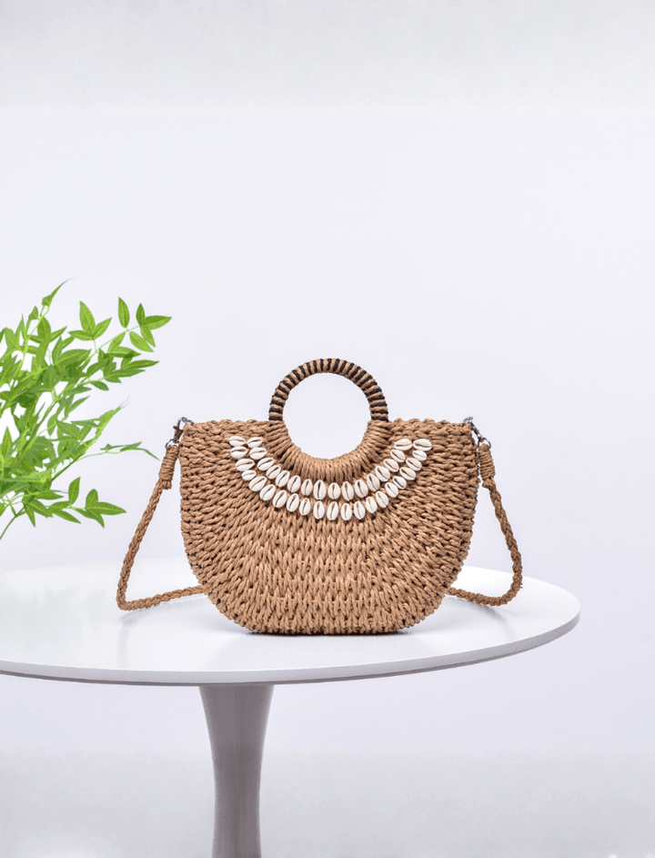 Bolso de estilo clutch o crossbody con una distintiva forma de media luna. Confeccionado en material de paja o rafia trenzada, es ideal para la playa o el verano. Su diseño destaca por un collar de conchas marinas blancas bordadas en la parte frontal. Cuenta con una asa de mano superior circular envuelta en un patrón de rayas y una correa larga y trenzada para llevarlo al hombro. Un accesorio artesanal con un toque boho costero.