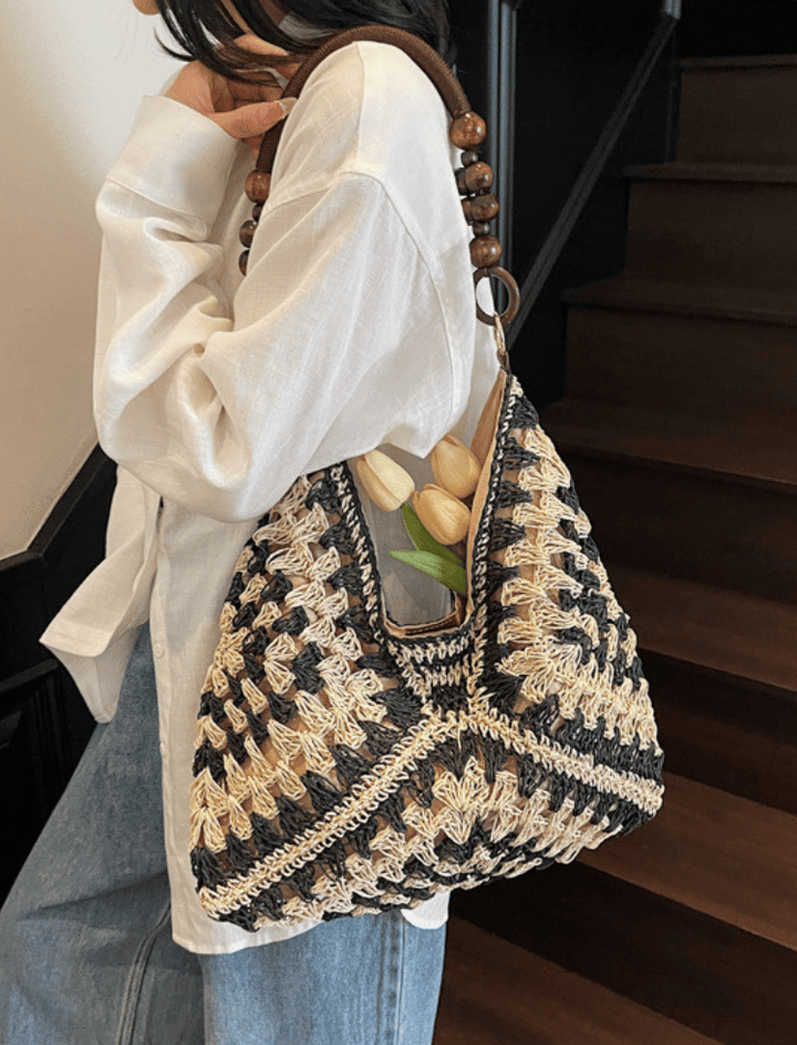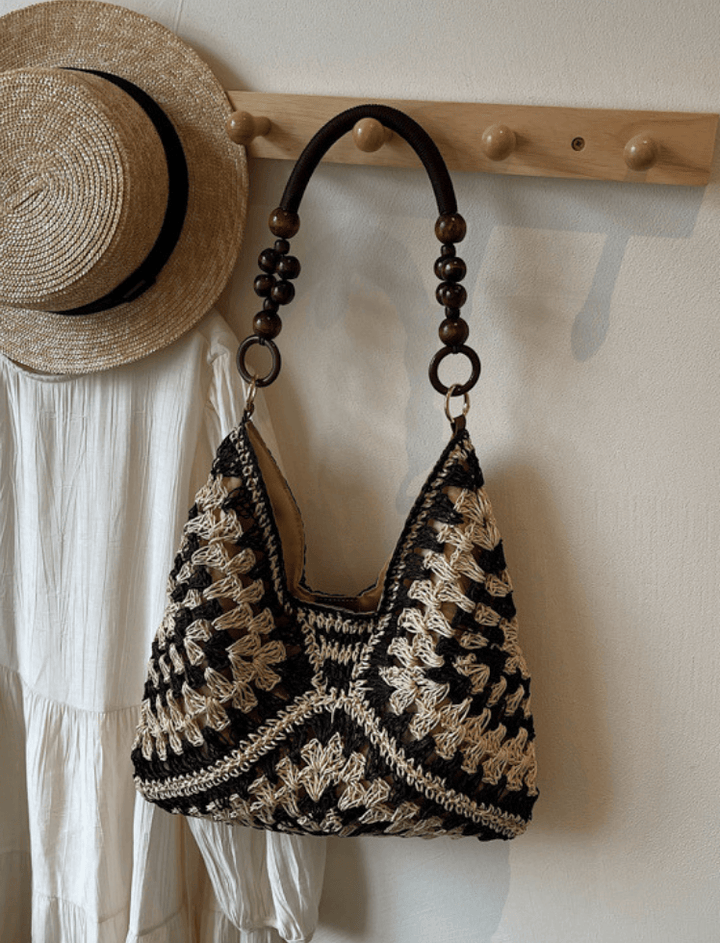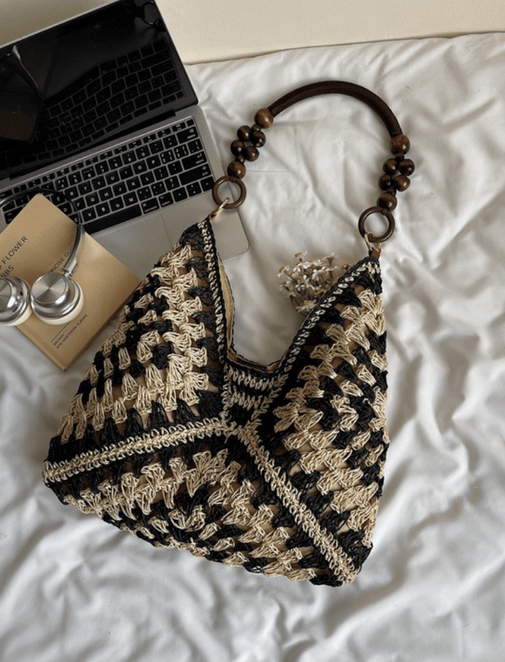 Bolso tejido con diseño artesanal y estilo bohemio, ideal para looks veraniegos o casuales. Su estructura flexible ofrece comodidad y ligereza, mientras que el asa adornada con cuentas de madera añade un toque distintivo y elegante. Perfecto para quienes buscan un accesorio con encanto natural y auténtico.
