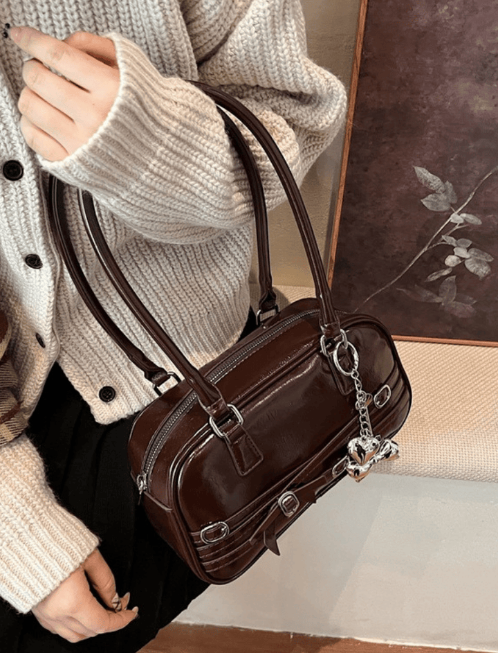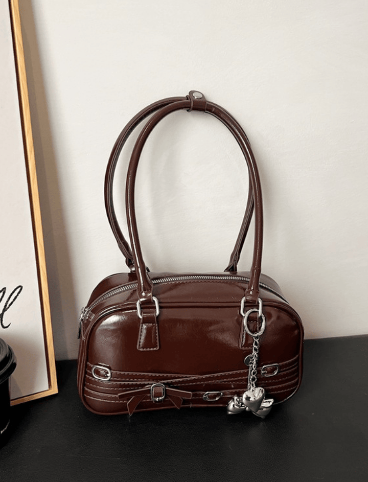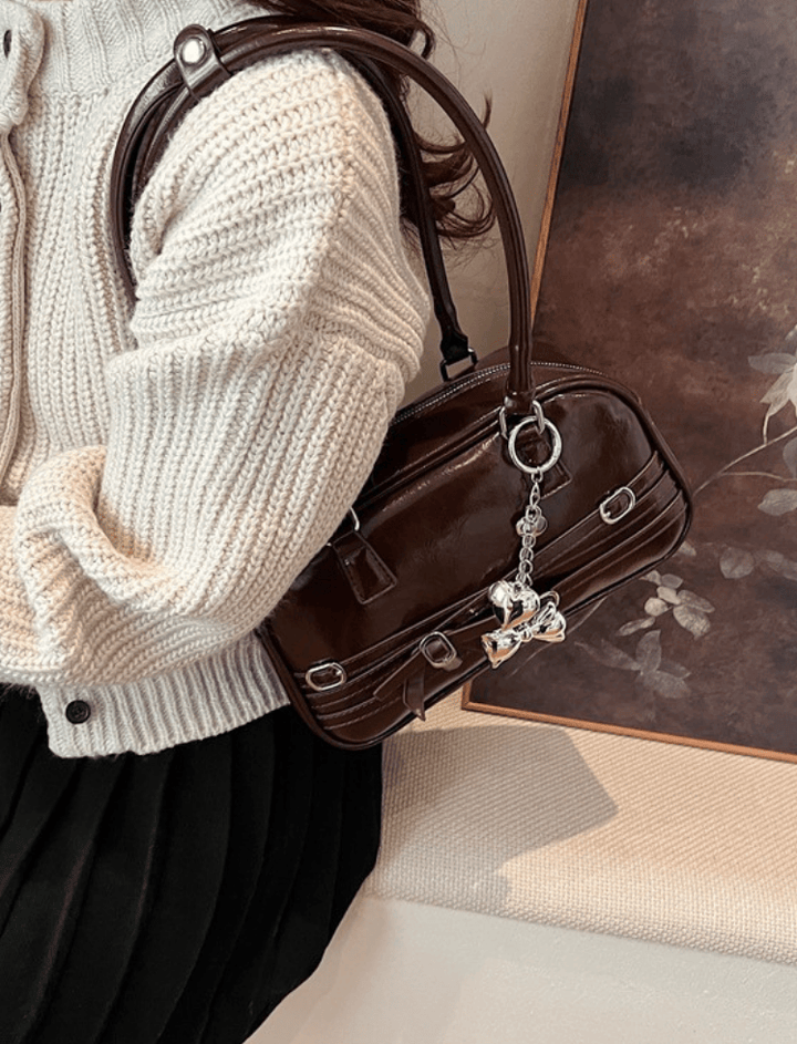 Bolso de hombro estilo bowling de silueta alargada y redondeada. Presenta un acabado de charol brillante para un estilo audaz y grunge-chic. Su diseño se adorna con tiras horizontales y herrajes de hebilla metálica, y un lazo central que añade un toque coquette. Cuenta con asas dobles finas y largas y un cierre de cremallera superior con tiradores en forma de charm. Un accesorio compacto e impactante.