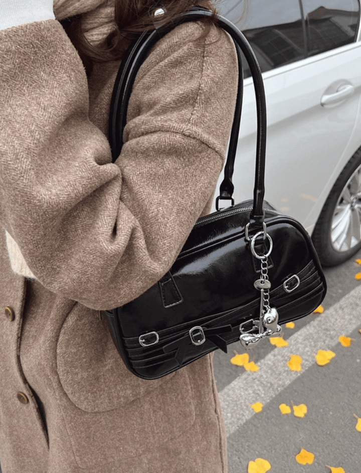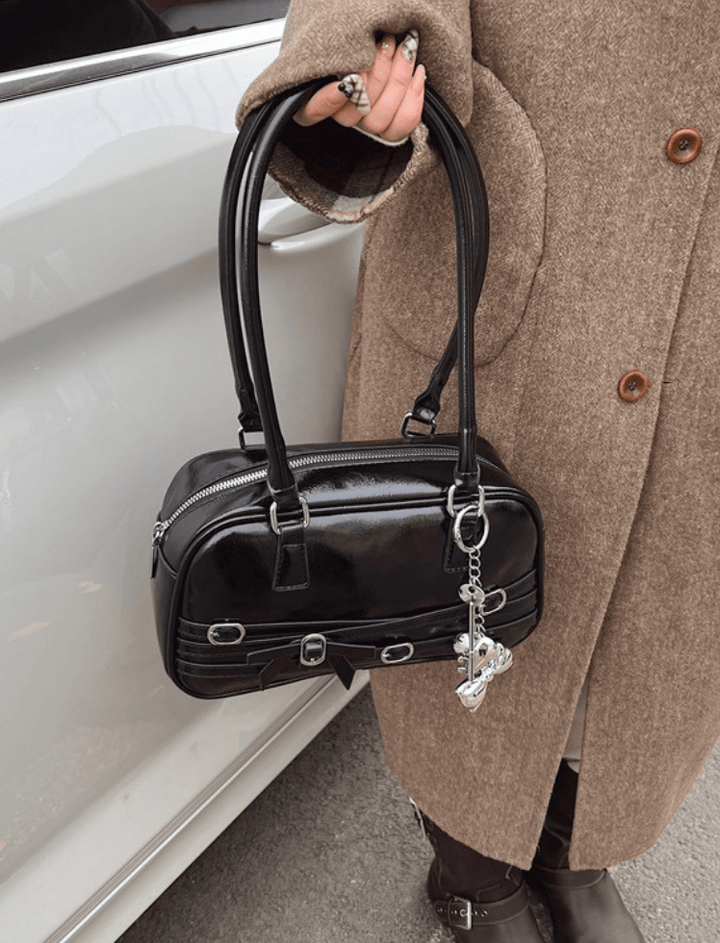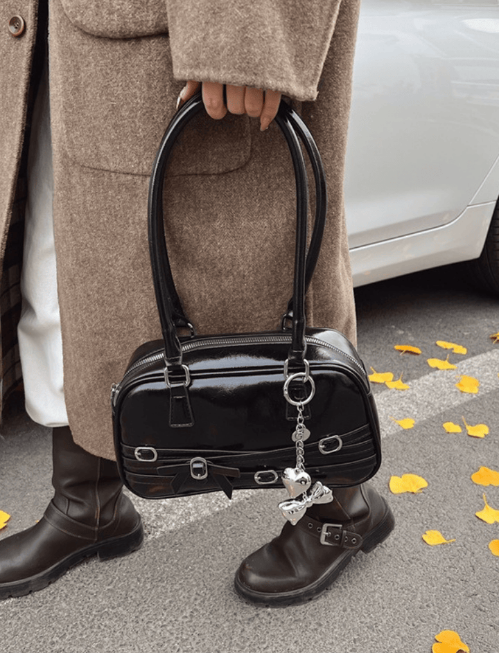 Bolso de hombro estilo bowling de silueta alargada y redondeada. Presenta un acabado de charol brillante para un estilo audaz y grunge-chic. Su diseño se adorna con tiras horizontales y herrajes de hebilla metálica, y un lazo central que añade un toque coquette. Cuenta con asas dobles finas y largas y un cierre de cremallera superior con tiradores en forma de charm. Un accesorio compacto e impactante.