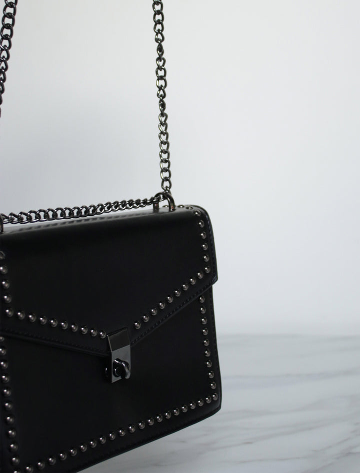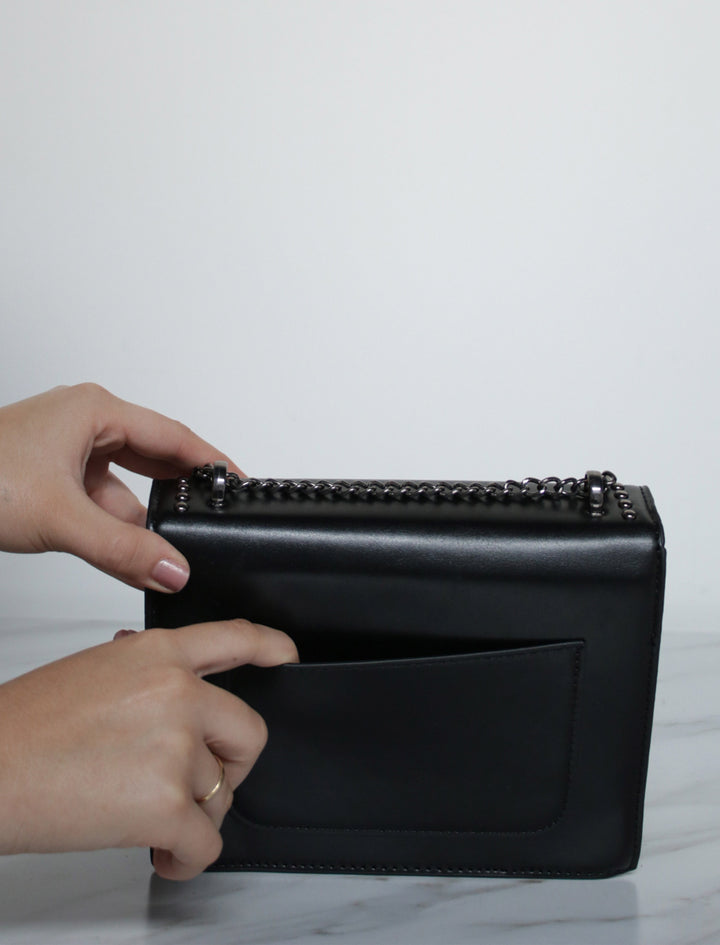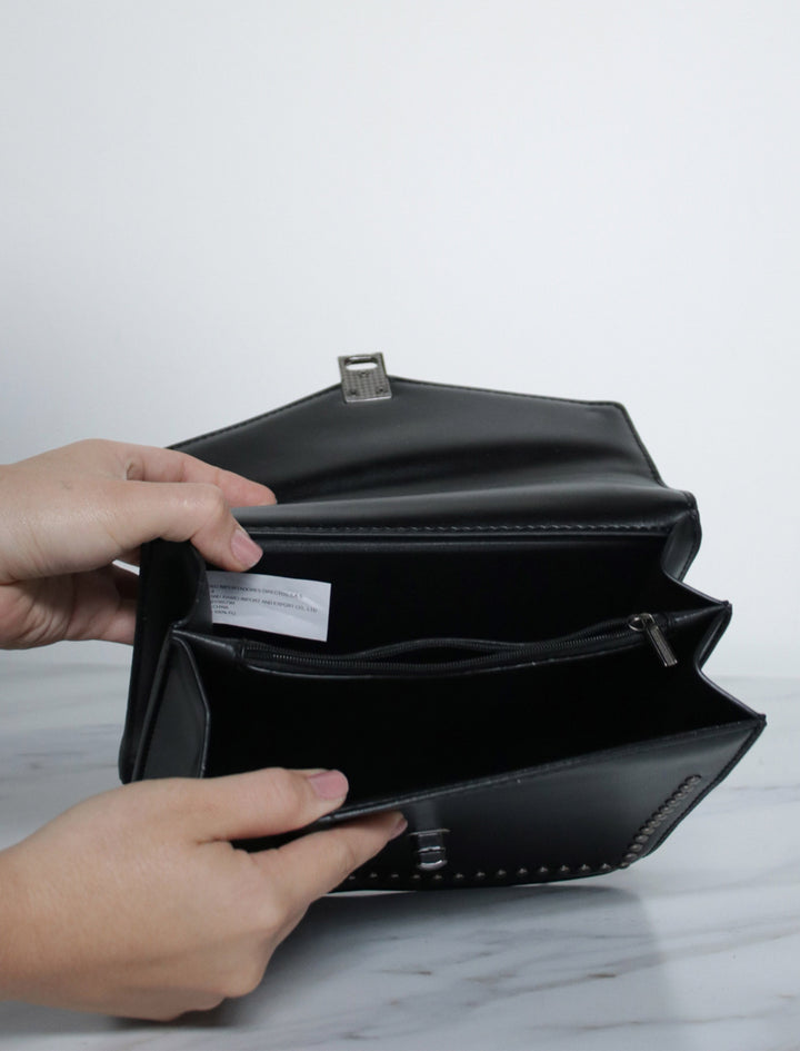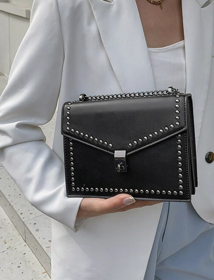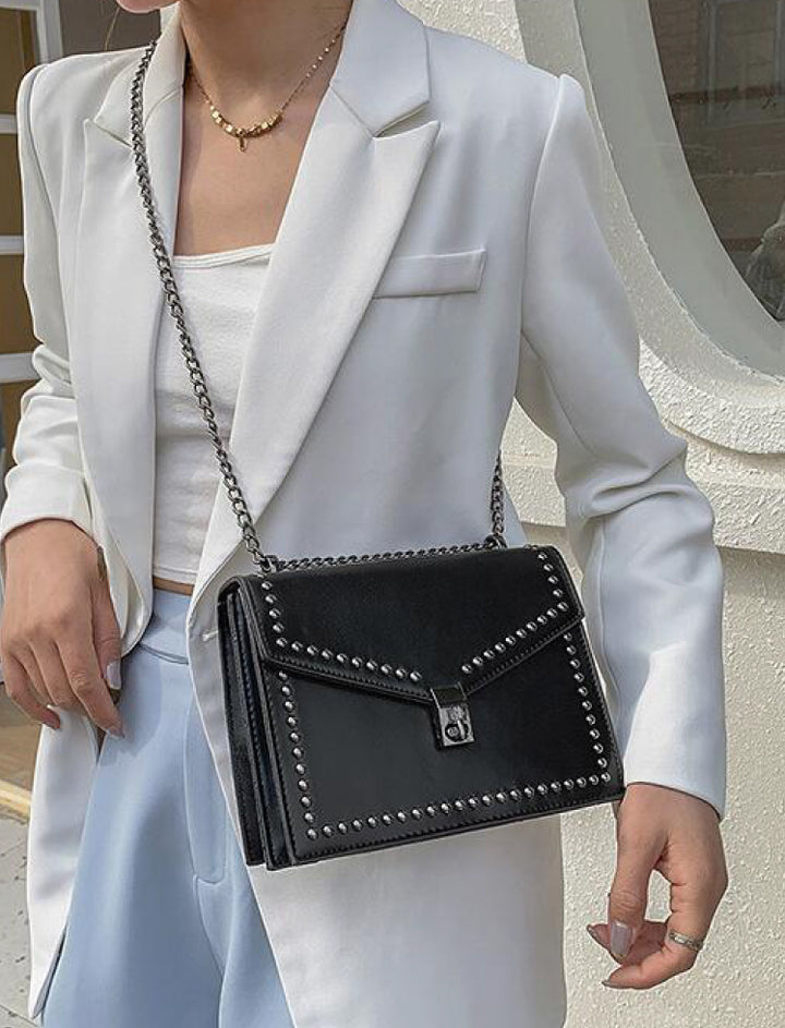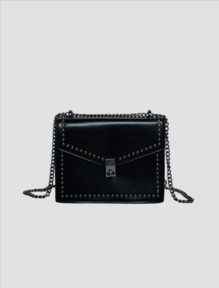 - Bolso tipo sobre con taches decorativos en bordes, tapa con broche moderno, compartimento principal con división y bolsillo interno con cierre, cadena principal fija y graduable.
