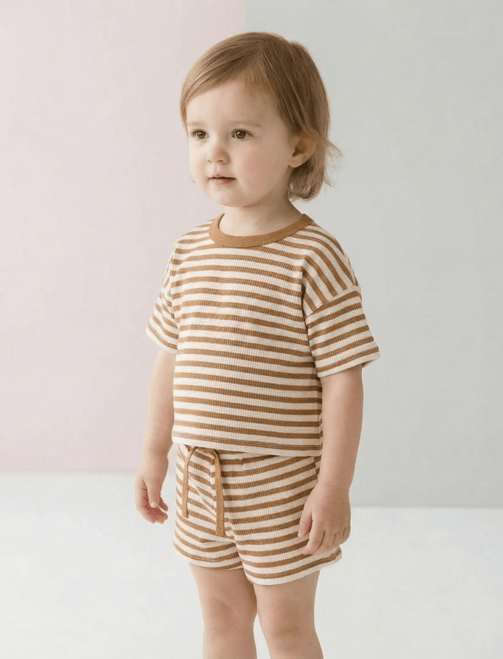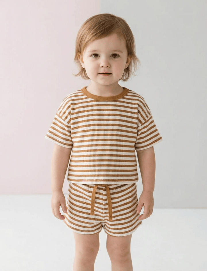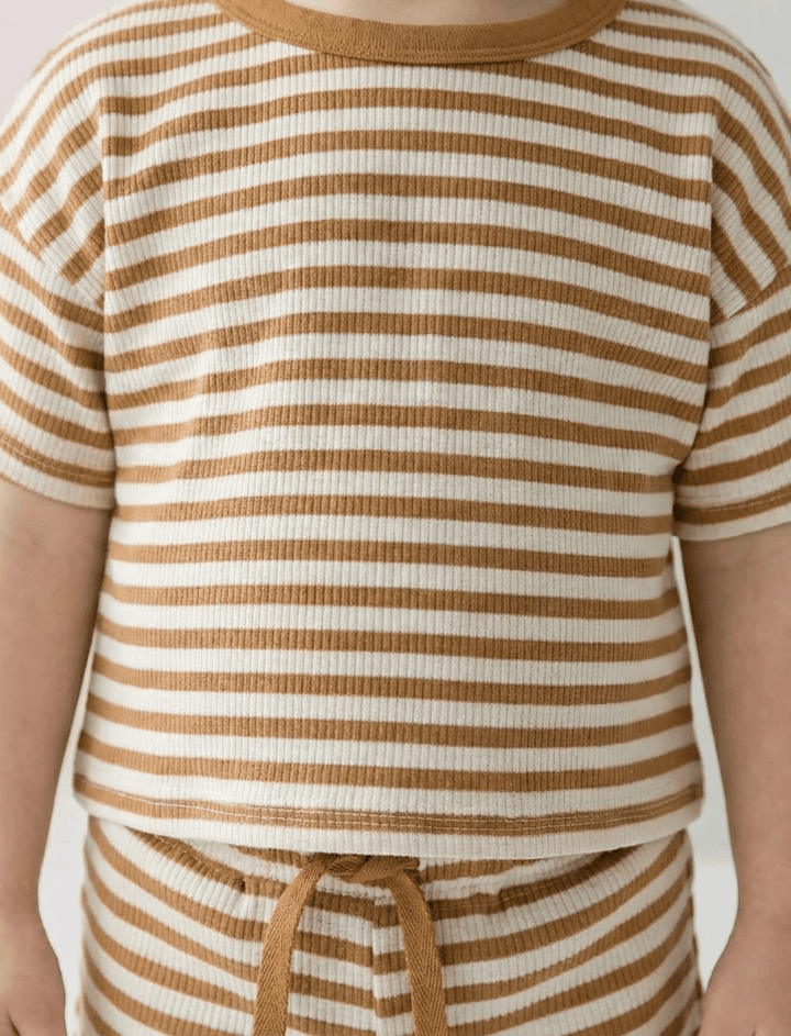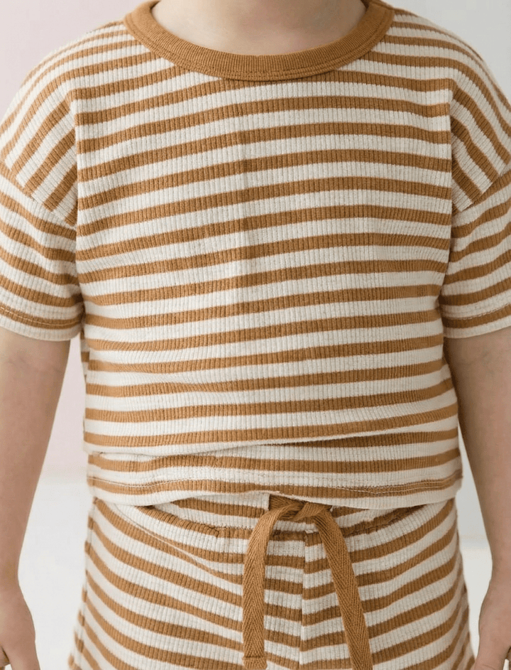 CONJUNTO SHORT RAYAS MOSTAZA CAMISETA MANGA CORTA