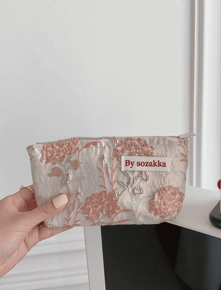 Confeccionada en un tejido de satén con un delicado acabado floral que le da un toque sofisticado y único. Su diseño compacto y suave la convierte en la opción perfecta para organizar tus productos esenciales, desde cosméticos hasta pequeños accesorios.