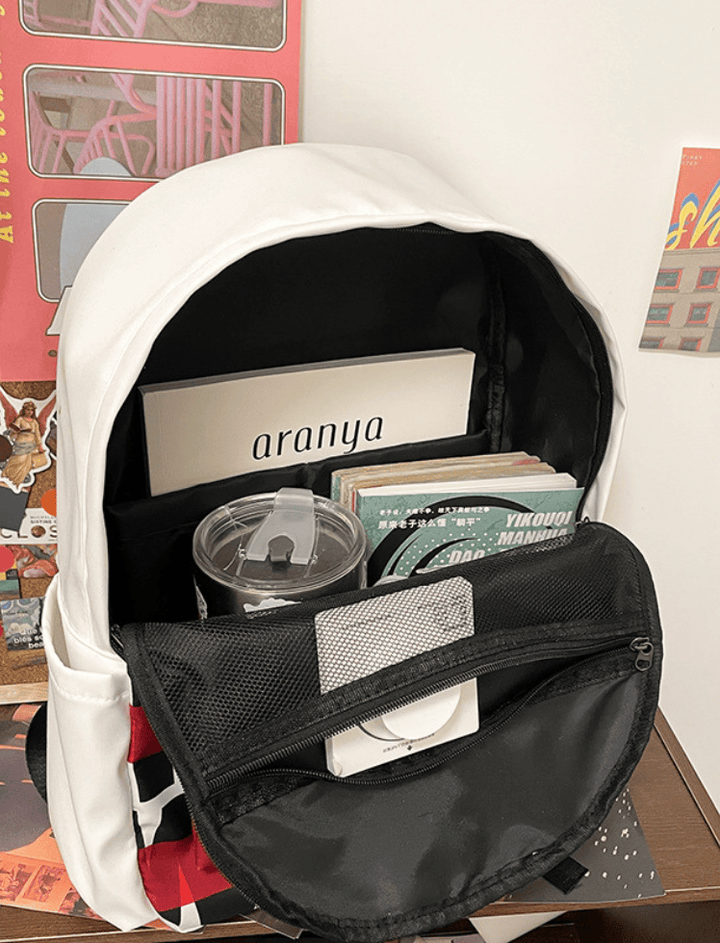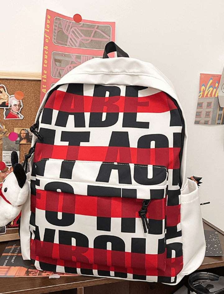 Mochila moderna con franjas rojas, blancas y negras y tipografía bold que aporta un estilo urbano y vibrante. Ligera, práctica y con un llavero de peluche que añade un toque cute perfecto para destacar en cualquier ocasión.