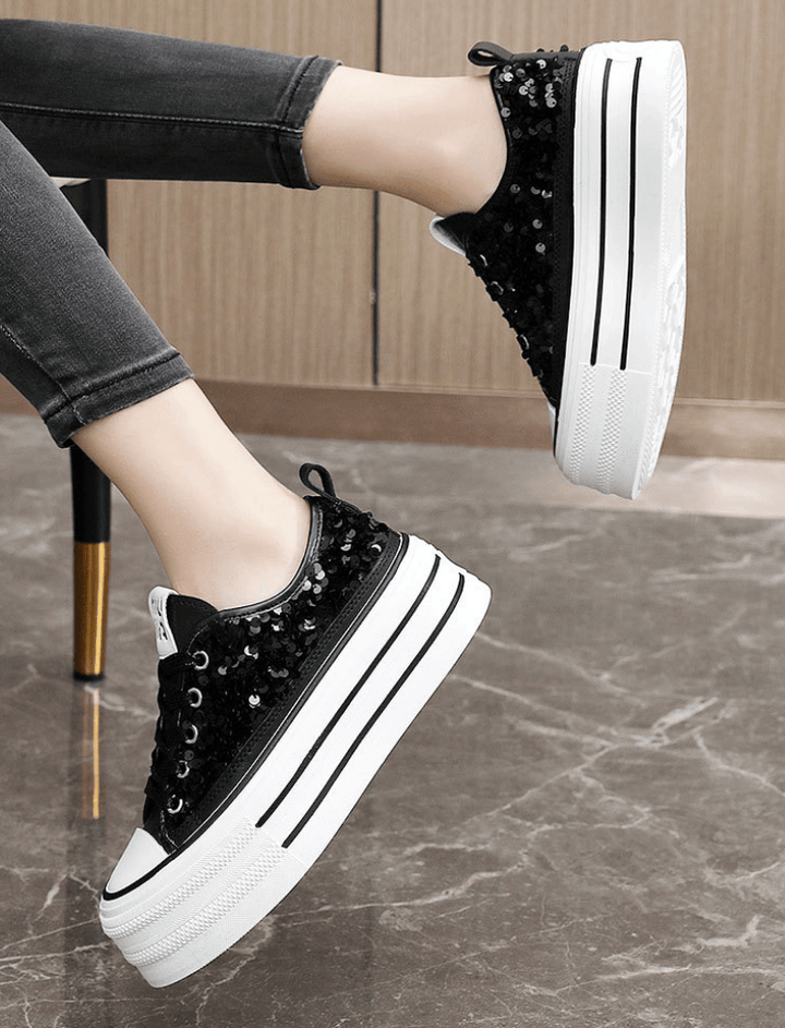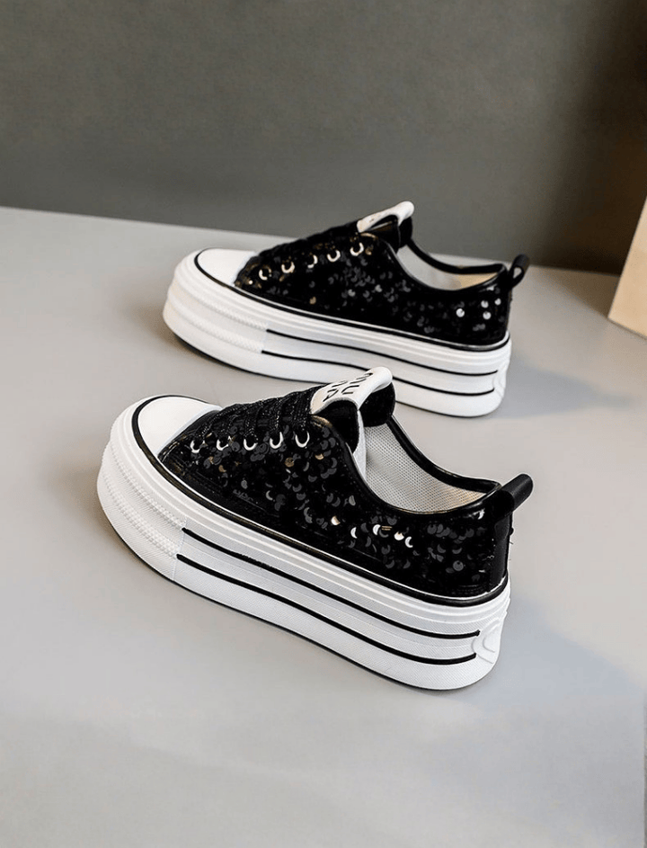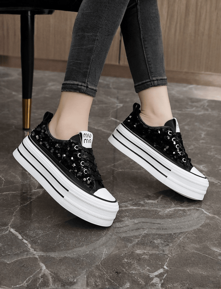 Tenis con plataforma alta y diseño moderno cubierto de lentejuelas brillantes. Cuenta con cordones ajustables y suela gruesa de estilo urbano que aporta comodidad y un toque atrevido. Perfectos para destacar cualquier outfit con un look glamuroso y contemporáneo.